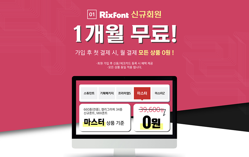 릭스폰트가 처음이신가요? 그렇다면 RixFont클라우드의 660종의 폰트 전종과 캘리그라피 34종, 신규 폰트 업데이트, Mix 폰트를 사용할 수 있는 마스터 서비스를 월 결제로 구독해 보세요. 지금 월 결제 카드 등록 시 4만원 상당의 마스터 구독 서비스가 첫 달 무료! 2021년 5월 3일 이전 구매 이력이 없는 회원이라면 이 기회를 놓치지 마세요😘