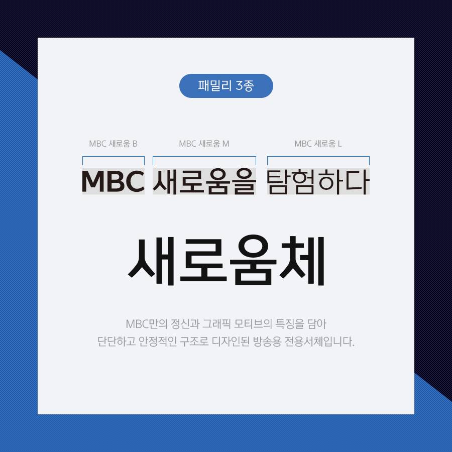 '새로움체'는 MBC의 아이덴티티를 잘 보여줄 수 있도록 디자인했습니다. 뉴스뿐 아니라 교양, 예능 프로그램, 웹페이지 등 방송사의 여러 용도에 다양하게 쓰이도록 3가지 굵기로 활용도를 높였습니다.