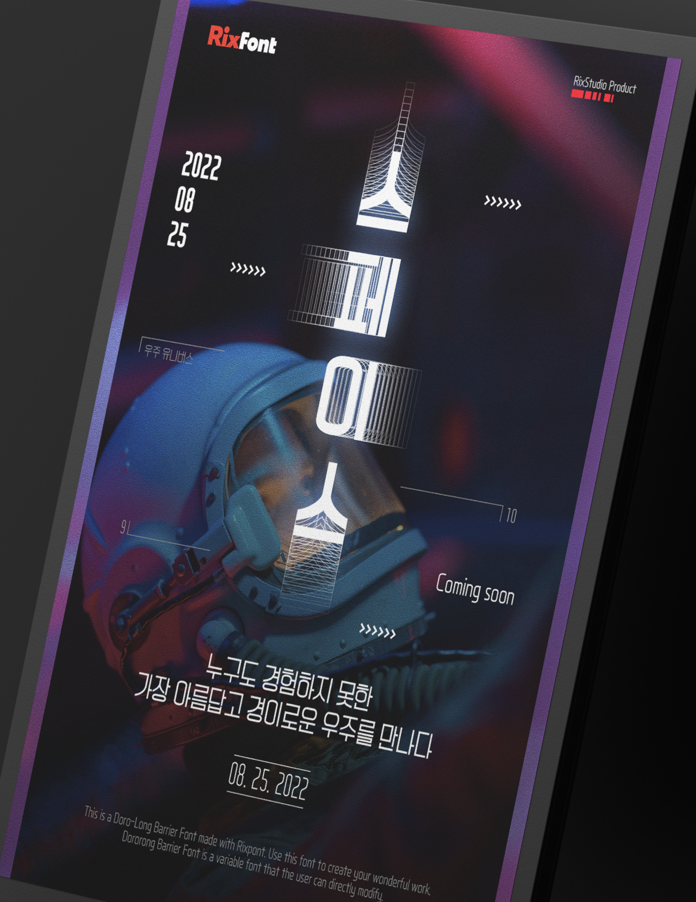 폭이 좁고 깔끔한 인상의 Rix도로롱 서체를 기반으로 제작한 배리어블 폰트입니다.
