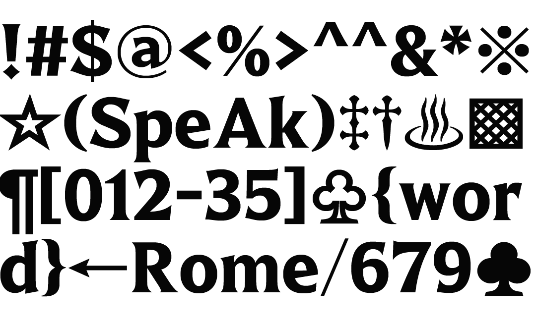 라틴 94자 외 라틴 확장 178자와 숫자, 약물 등에도 같은 특징을 적용하여 여러 문자를 섞어 써도 이질감이 없도록 개발했습니다. 영문, 숫자, 특수기호 디자인에도 넓게 퍼지는 세리프와 작은 획 대비로 일관된 인상을 주도록 디자인했습니다.