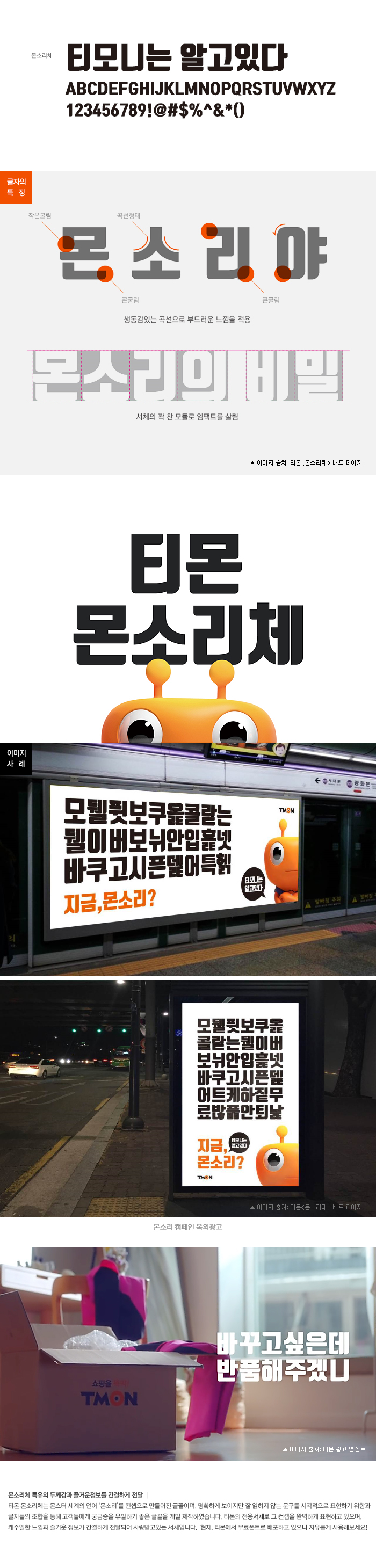 티몬의「티몬체」(구명칭'몬소리체'/RixFont제작)는 몬소리 캠페인의 일환으로 제작되고 활용되었는데, 몬소리 캠페인은 소비자들이 힘들고 지칠 때 무심코 내는 웅얼거림으로, 티몬만이 알아들을 수 있는 고객의 목소리를 말합니다. 예를 들어 '모뒐퓟보코옱콜랐는데망햁'은 '모델핏보고 옷 골랐는데 망했다' 등으로 해석 되는거죠. 이는 고객과의 소통을 통해 소비자들 불만을 보다 잘 받아들여 고객만족도를 극대화하기 위한 캠페인으로, 이를 위해 유명 톱모델이 아닌 자사 캐릭터 '티모니'를 활용해 TV CF 영상을 제작했으며 친근하고도 일관된 이미지로 브랜드 캠페인을 진행했습니다.