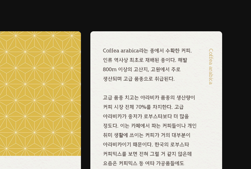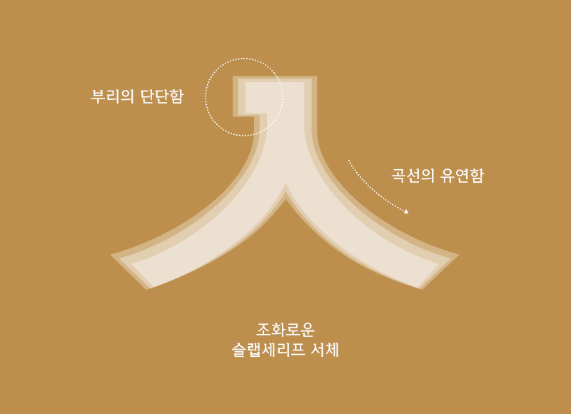 획 순서를 고려해 적용한 세리프는, 다소 둔탁해 보일 수 있는 각이 진 형태를 보완하여 쉐입이 보다 자연스러워 보일 수 있도록 디자인했습니다. 직각 세리프가 단단한 힘을 실어 주지만 과하지 않게 디자인되어 전체적으로 단정한 느낌을 줍니다.