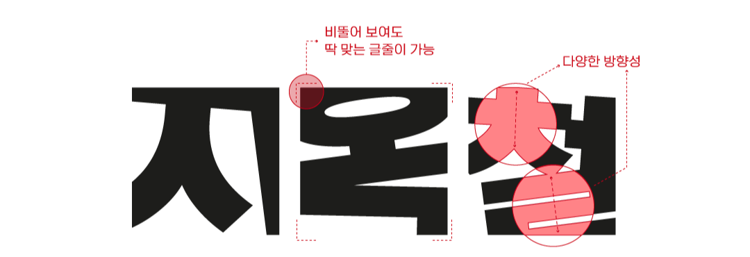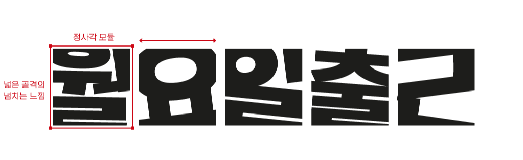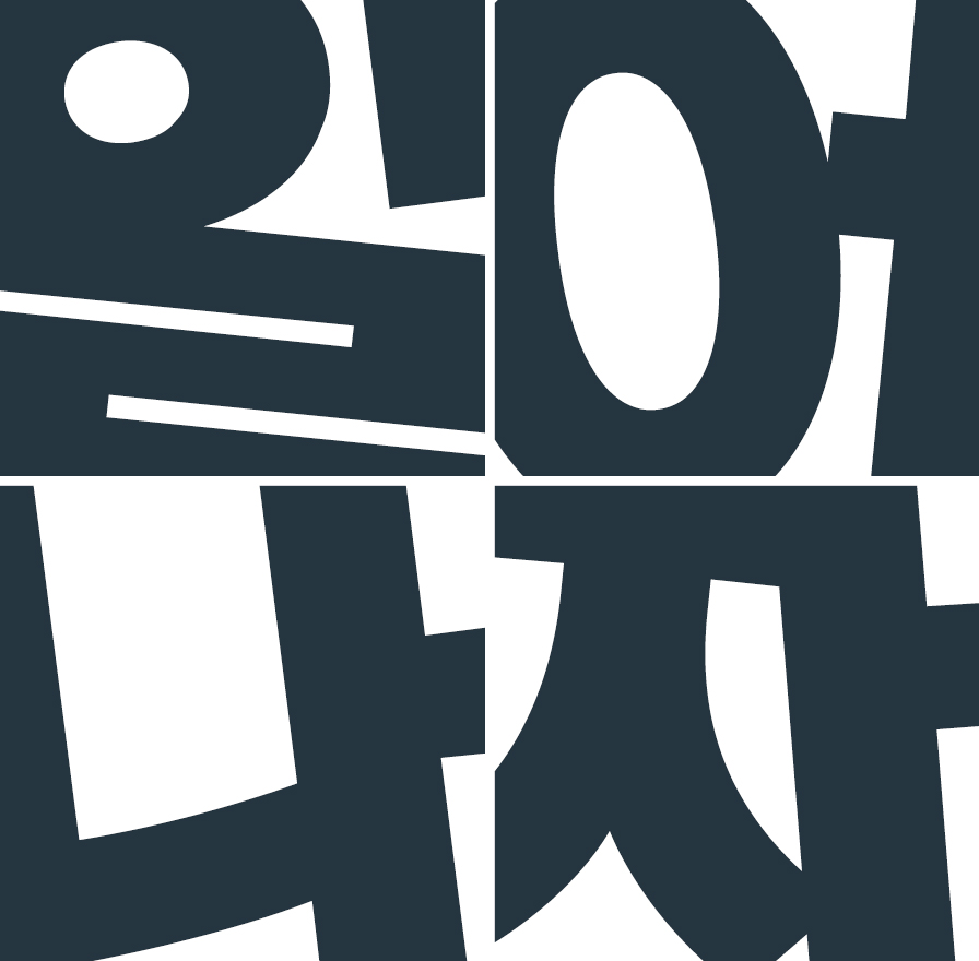 전후좌우 꽉 막힌 출퇴근길 지옥철을 표현한 서체. 흔들거리는 지하철 안에서 샌드위치처럼 포개진 사람들과 다양한 표정들을 네모난 박스 안에 각기 다른 방향성을 가진 자소들로 표현했습니다. 시각적으로 굉장히 비뚤어 보이지만 글줄은 정리되어 보여 가독성을 크게 해치지 않습니다. 굵기는 한 가지로 단단하고 주목도 높은 두꺼운 획이 제목용으로 활용하기 좋습니다.